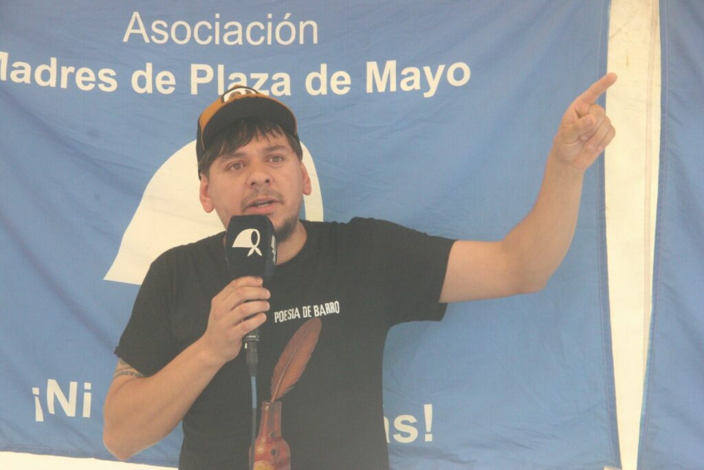 Más adelante, Demetrio presentó a Nahuel Arrieta, a quien definió como un vecino de la Villa 21-24 que estaba a punto de recibirse de maestro en el Profesorado Pueblos de América, una institución creada desde la comunidad y que funciona en el propio barrio. Remarcó, con orgullo, que Nahuel sería un maestro villero, pero advirtió que el Gobierno de la Ciudad pretendía cerrar ese espacio de formación porque —según dijo— le molestaba que los villeros estudien, se organicen y formen a los pibes del propio barrio. Luego le cedió la palabra.