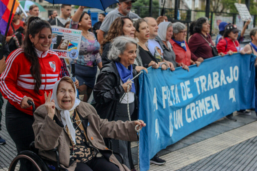 Ya en el cierre de la jornada, tomaron la palabra las Madres de Plaza de Mayo Carmen Arias y “Pina” de Fiore, quienes llevaron a la Plaza un mensaje directo, sin rodeos y profundamente político. “Seguimos cada vez más enojados con este gobierno”, comenzó Carmen, marcando el clima que atravesó la Marcha, y llamó a “elegir otro camino para sacarlos”, en rechazo a las políticas que —según denunció— avanzan contra la educación pública, la salud y los sectores más vulnerables.