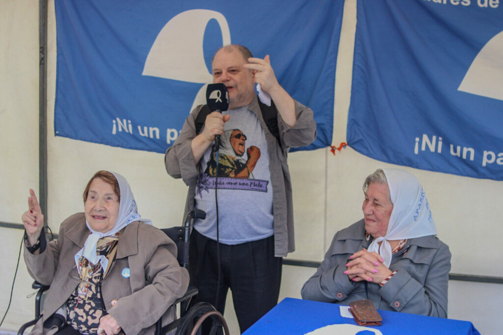 Luego, fue el turno de escuchar al periodista especializado en geopolítica Gabriel Wainstein, quien llevó a la Plaza una lectura internacional atravesada por la memoria y el presente. “Es una emoción muy grande estar acá, en esta plaza del coraje, del reclamo de memoria, verdad y justicia”, comenzó, y no dudó en inscribir su intervención en la historia viva de las Madres: “el más grande ejemplo de valentía de la Argentina”, dijo, recordando también a Hebe. En el mismo tono, señaló que su presencia allí también respondía a una historia personal y colectiva: la de los 108 compañeros desaparecidos del Colegio Nacional de Buenos Aires en la dictadura.